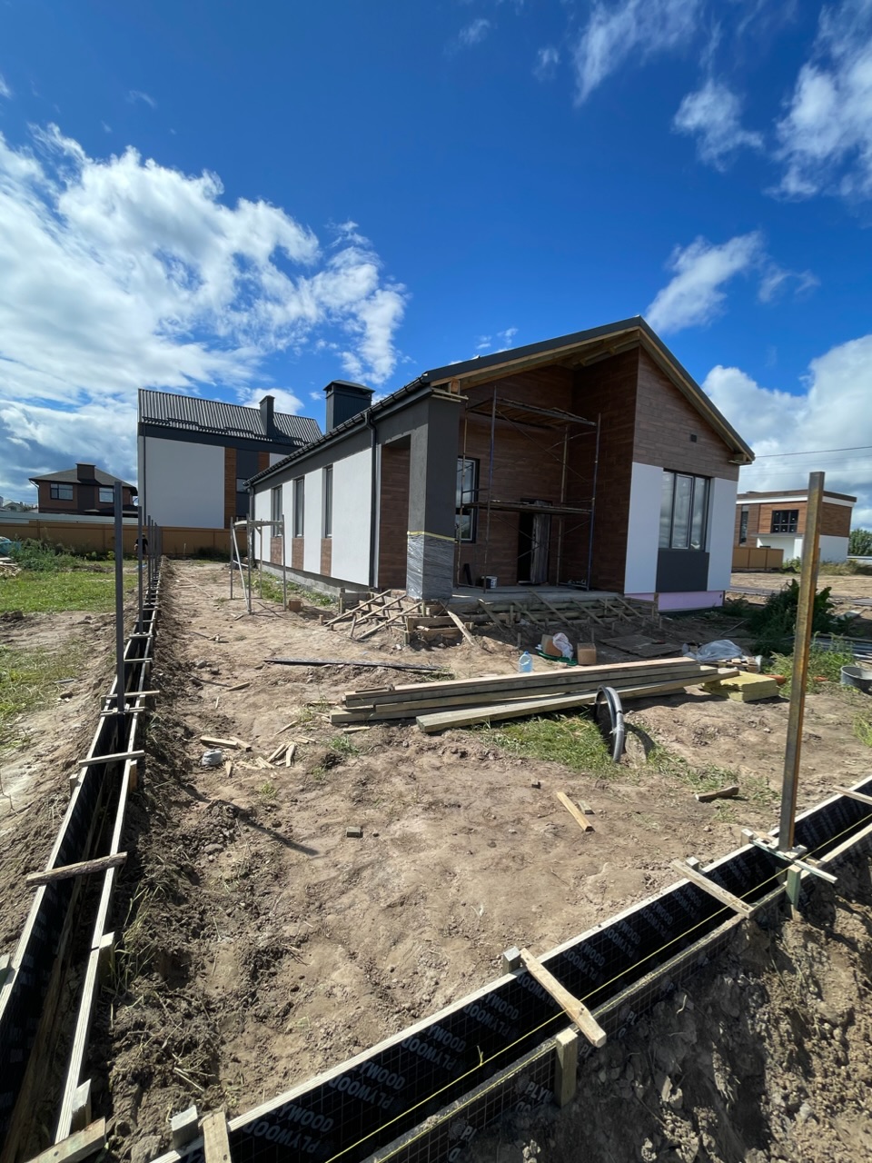Завершено фасадні роботи. Розпочали бетонні роботи з влаштування опалубки паркану та сходів на ґанку і терасі